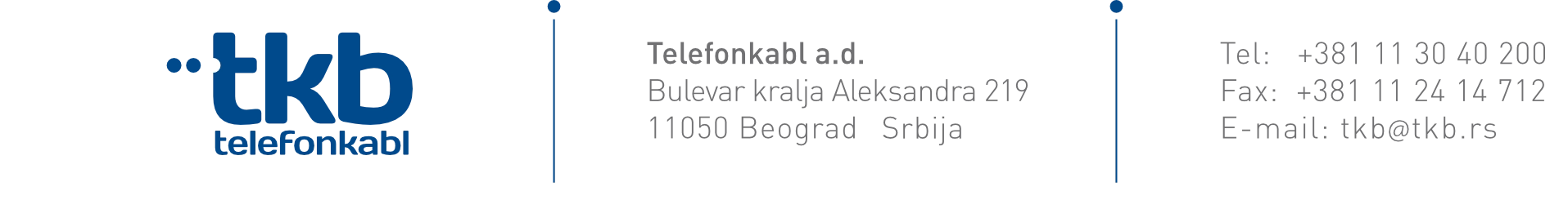 Telefonkabl d.o.o. Bulevar kralja Aleksandra 219 11050 Beograd E-mail: tkb@tkb.rsTel. +381 11 30 40 200